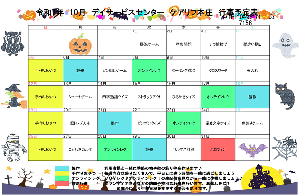 デイサービスの10月の行事予定表を掲載しました。